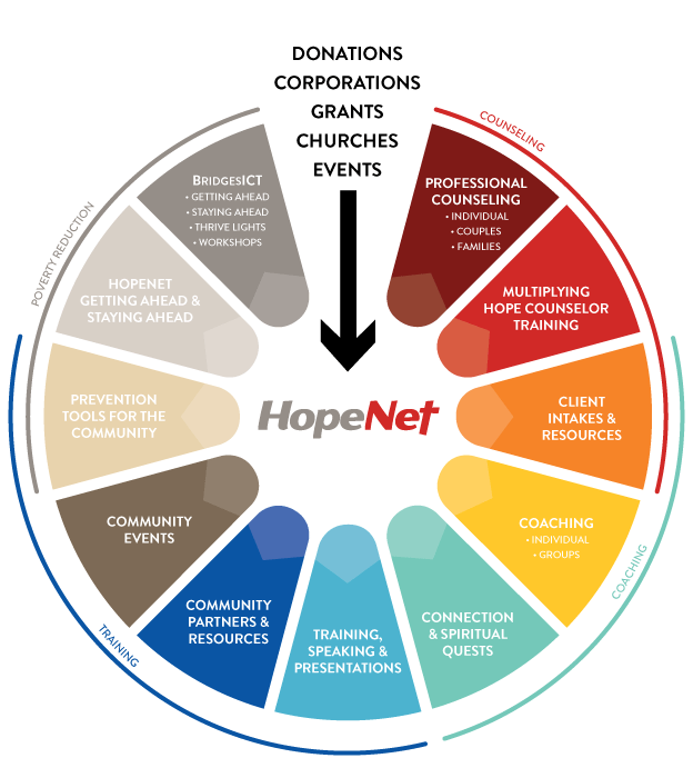 As a 501(c)3 faith-based nonprofit, we are committed to removing barriers so that every person, regardless of income, can access the help they need. Through professional counseling, poverty reduction programs, coaching, and training, HopeNet surrounds people with the support to find healing, stability, and strength. All of our services are offered on an ability-to-pay basis, made possible through the generosity of donors who believe in the power of hope.